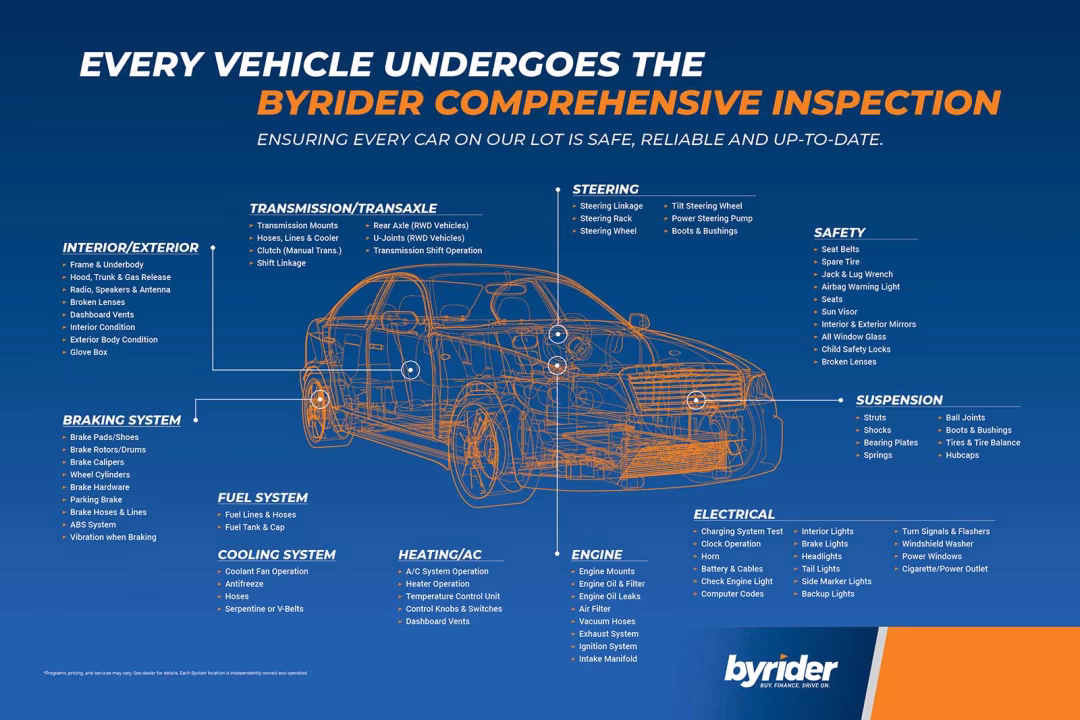 When you buy a car from Byrider, you can feel confident that you're getting a quality vehicle. Before we allow a used car into our inventory, we put it through a full, detailed vehicle inspection process to make sure it's in great shape.